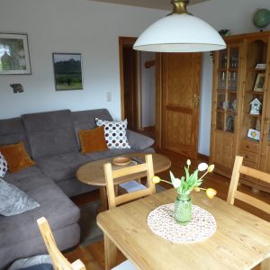 Die helle Ferienwohnung ist optimal für eine Nutzung zu viert geeignet. Sie verfügt über ein geräumiges Schlafzimmer mit Doppelbett und ein kleineres Schlafzimmer mit zwei Einzelbetten. Im Wohnzimmer können Sie auf der bequemen Couch entspannt Fernsehen (Flachbildschirm mit Sat-Empfang), Musik hören oder den einzigartigen, unverstellten Ausblick auf den Eulenberg, das Eichfeld und die Veste Wachsenburg genießen.