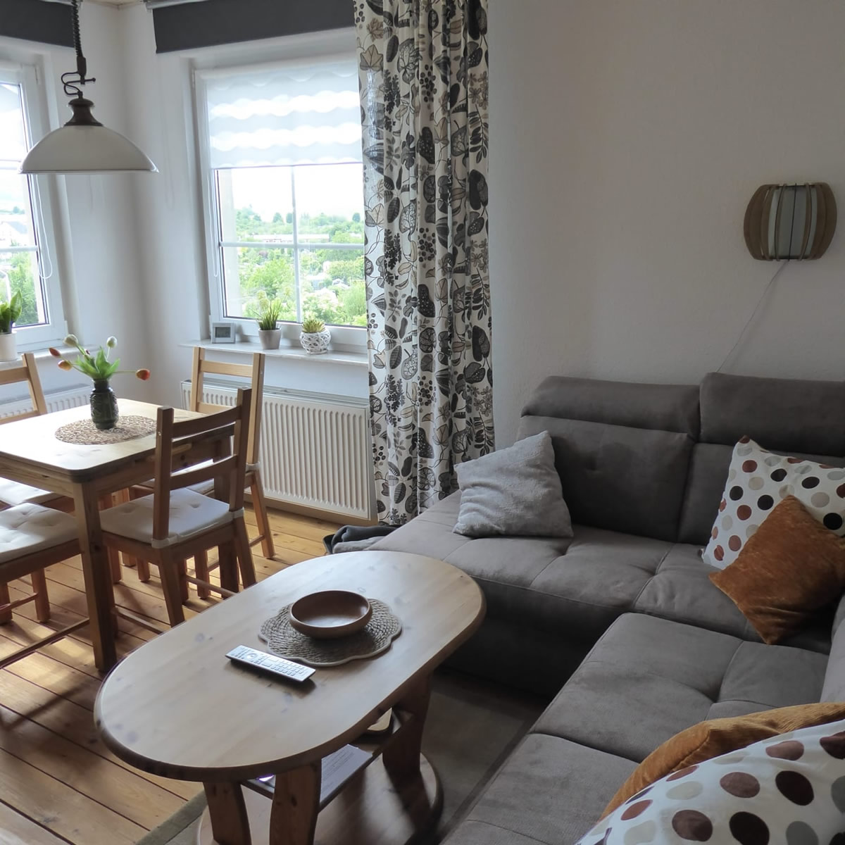 Die helle Ferienwohnung ist optimal für eine Nutzung zu viert geeignet. Sie verfügt über ein geräumiges Schlafzimmer mit Doppelbett und ein kleineres Schlafzimmer mit zwei Einzelbetten. Im Wohnzimmer können Sie auf der bequemen Couch entspannt Fernsehen (Flachbildschirm mit Sat-Empfang), Musik hören oder den einzigartigen, unverstellten Ausblick auf den Eulenberg, das Eichfeld und die Veste Wachsenburg genießen.